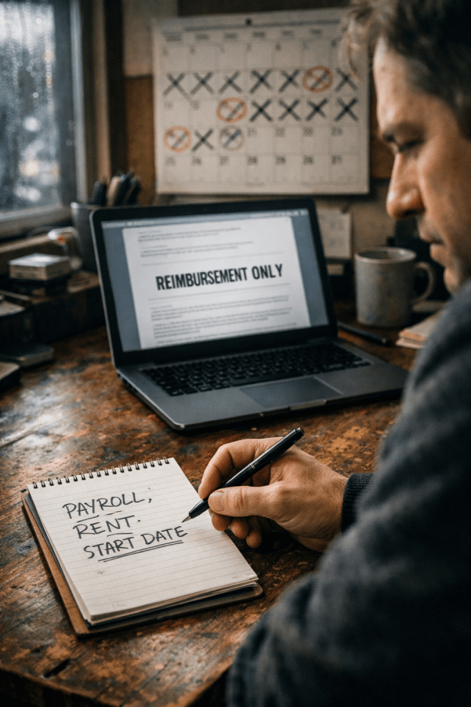 Frontloaded startup disbursements. Pay at the start for staffing, setup, required compliance, and launch costs. Programs do not begin with invoices; they begin with people.